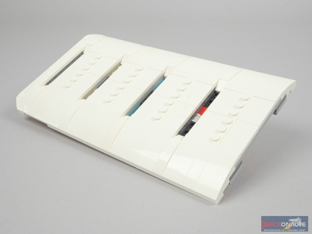Il ne manque plus grand-chose à notre combi. On continue en construisant le toit, dont la partie supérieure est assez simple et consiste à superposer des plates et des éléments lisses. En dessous, on fixe les premiers éléments du mécanisme de déploiement du toit, et les différentes petite boules qui serviront à attacher la toile. Remarquez ici l’amortisseur à ressort qui aura pour fonction de maintenir le toit ouvert ou fermé.