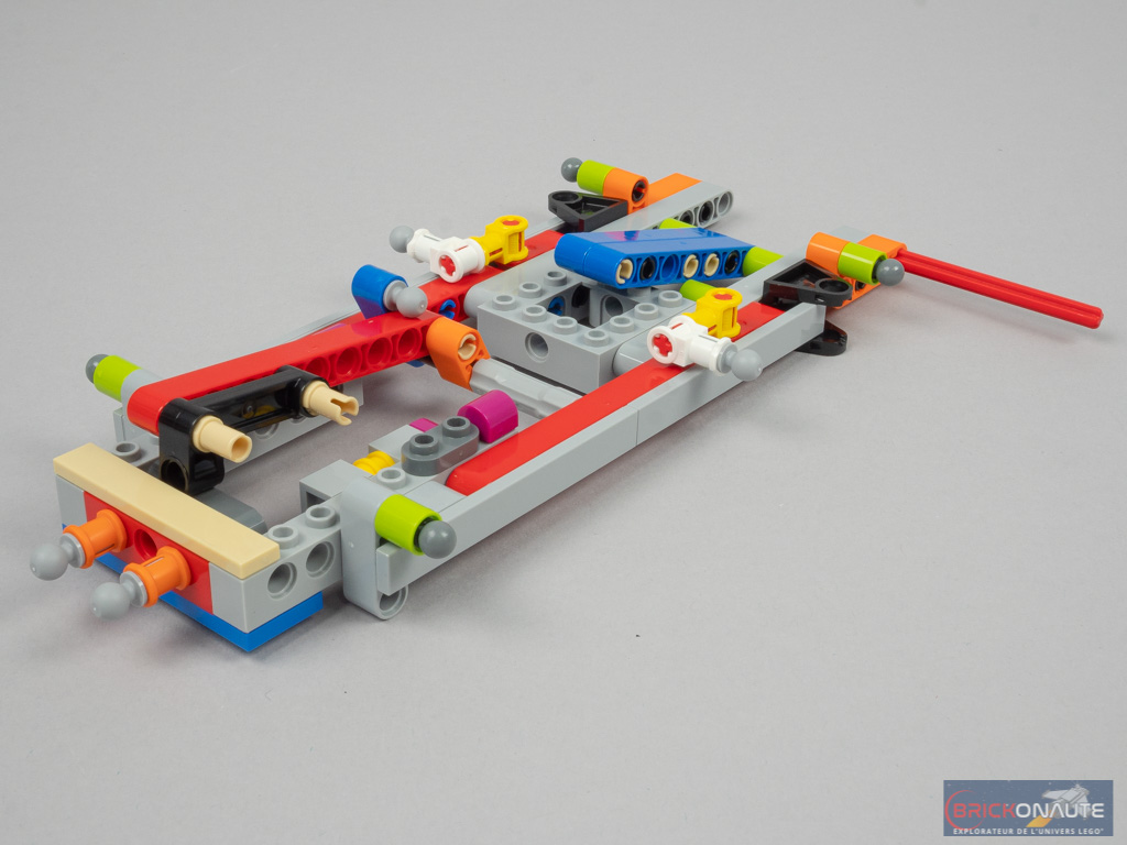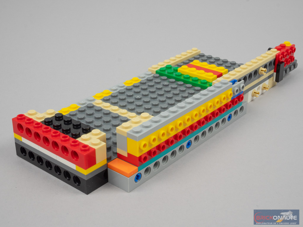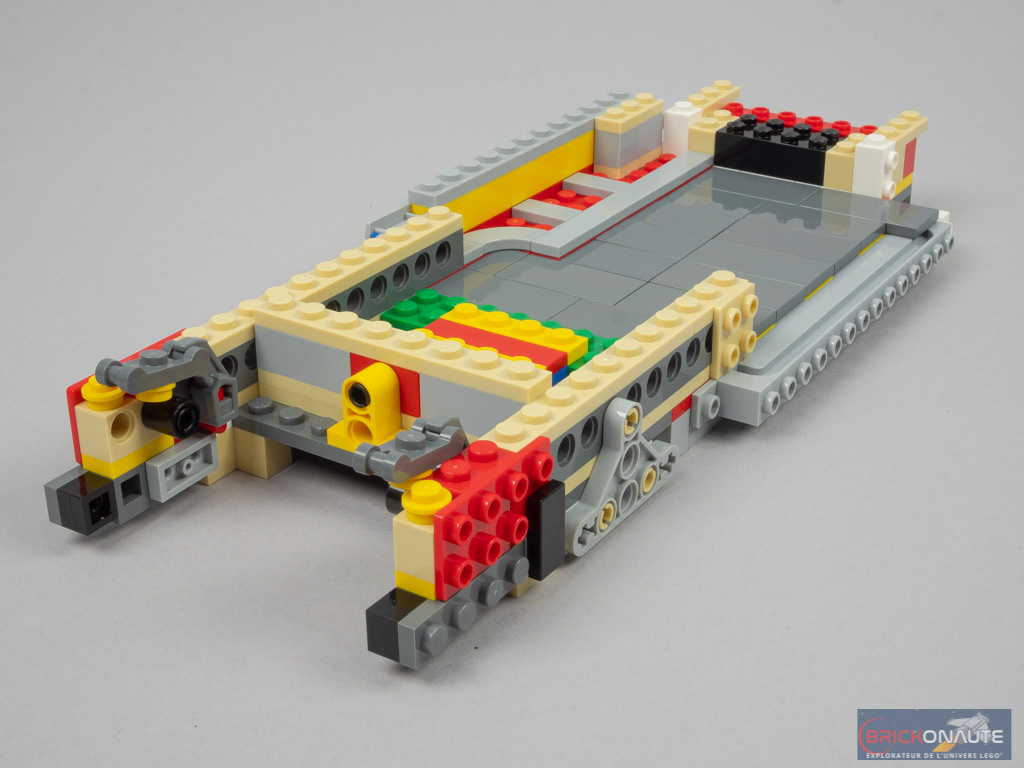 La construction commence par le châssis du véhicule, composé pour l’essentiel d’éléments Technic. Sur les côtés, on fixe les premiers éléments SNOT qui recevront ensuite la carrosserie. Côté intérieur, on ajoute le plancher tandis qu’à l’arrière, on aperçoit déjà les éléments constituant le mécanisme de fermeture du compartiment moteur.