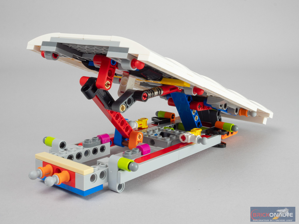 Décidément, il y en a des pièces Technic dans ce van ! On continue l’assemblage avec le reste du mécanisme de déploiement du toit, qu’on fixe ensuite à la structure assemblée juste avant. On attache la toile mais malgré tout, le mécanisme reste légèrement visible. On insère alors l’ensemble depuis l’arrière en le coulissant – il faudra au préalable ouvrir le coffre qui, une fois fermé, contribuera au maintien de l’ensemble. On ajoute les 4 roues, puis la roue de secours permettant également d’actionner la direction. On termine la construction avec les 3 accessoires : un surf et deux chaises pliantes, qu’on pourra poser sur le toit dans l’emplacement ménagé à cet effet.