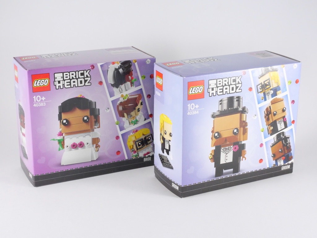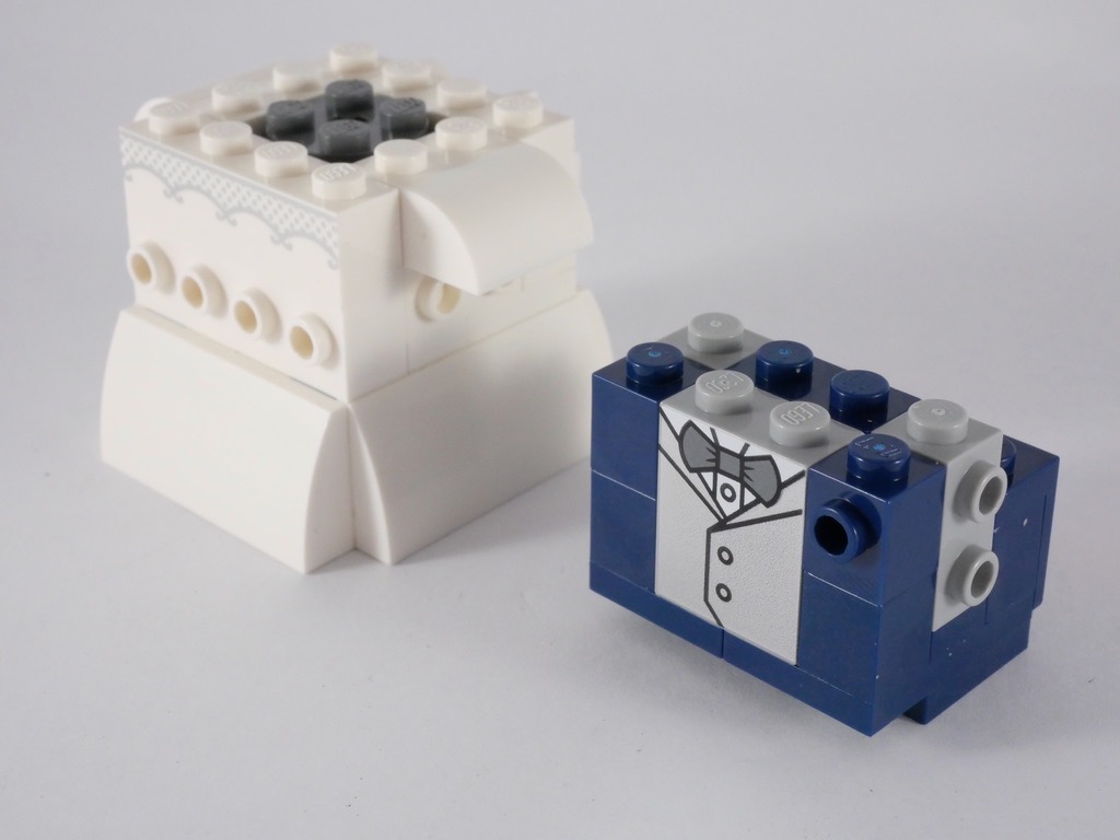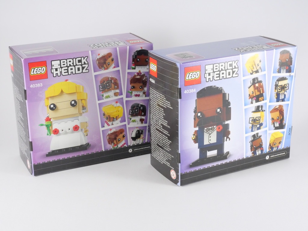 LEGO remet le couvert cette année avec deux petites boîtes portant les références 40383 Wedding Bride et 40384 Wedding Groom. Ces deux boîtes permettent la même personnalisation que le set 41597, à l’exception près que les personnages portent une robe et un costume de mariés. Une alternative au set 40197 Wedding Favour Set, qui représente les deux mariés sous une forme plus « traditionnelle » de minifig.