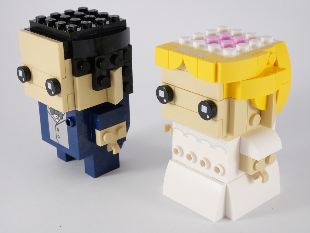 La construction ne vous surprendra pas si vous êtes un adepte de la gamme LEGO BrickHeadz. On commence par le torse, avant de créer la structure interne de la tête, puis « d’habiller » les différentes faces de celle-ci. On notera tout de même une construction intéressante des deux torses. Pour la mariée, à base de briques SNOT pour habiller les 4 côtés, et pour le marié une profondeur légèrement moindre pour accueillir la queue-de-pie. Les visages sont assez classiques, la chevelure de la mariée est joliment travaillée avec un morceau de tissu blanc décoré de quelques fleurs.