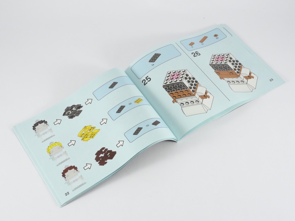 Dans chacune des boîtes, nous trouvons 4 sachets de pièces et une notice d’instructions. Après un « tronc commun » pour la construction de la robe et du costume, elles nous proposent diverses solutions pour changer la couleur de peau et celle des cheveux. Une personnalisation supplémentaire est proposée pour le marié, avec la possibilité d’une chevelure « complète » ou d’un chapeau.