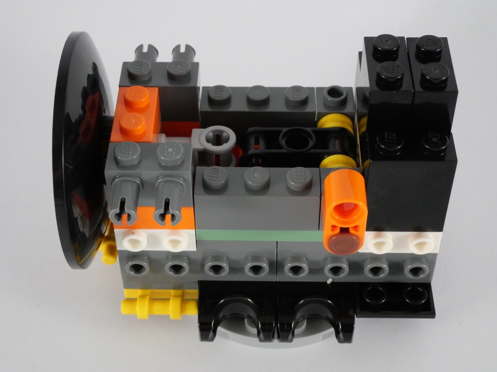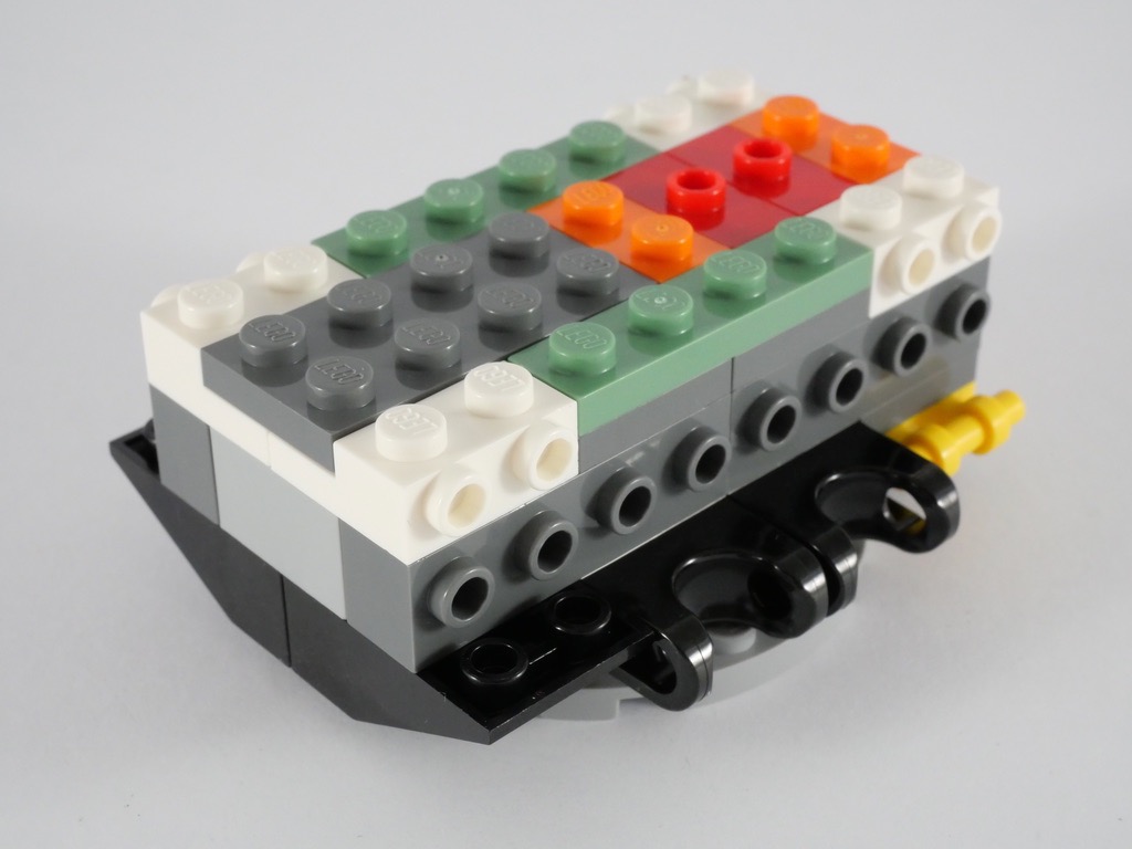 Nous répétons la même chose de l’autre côté. Les deux côtés sont symétriques, à un autocollant et au mécanisme de sortie du hamster près. Nous terminons l’engin en lui ajoutant un dish à l’avant et l’autre en dessous, et deux « mini-pattes » orange à l’avant.