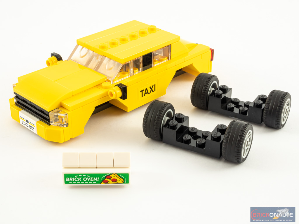 Pour être tout à fait honnête, j’étais déjà sceptique en découvrant les visuels du set. Et bien sa construction m’a conforté dans cet avis : c’est quand même très « rustique » pour un set LEGO sorti en 2021. Ça reste une voiture, mais c’est pour ainsi dire service minimum. On appréciera quand même que les feux soient brick-built – ce n’était pas nécessairement le cas des sets de la gamme LEGO Speed Champions de 6 tenons de large, comme notre taxi. La pancarte publicitaire est sympa avec d’un côté la Statue de la Liberté (c’est confirmé, nous sommes bien à NYC), et de l’autre des pizzas cuites dans un Brick Oven – un four en briques.