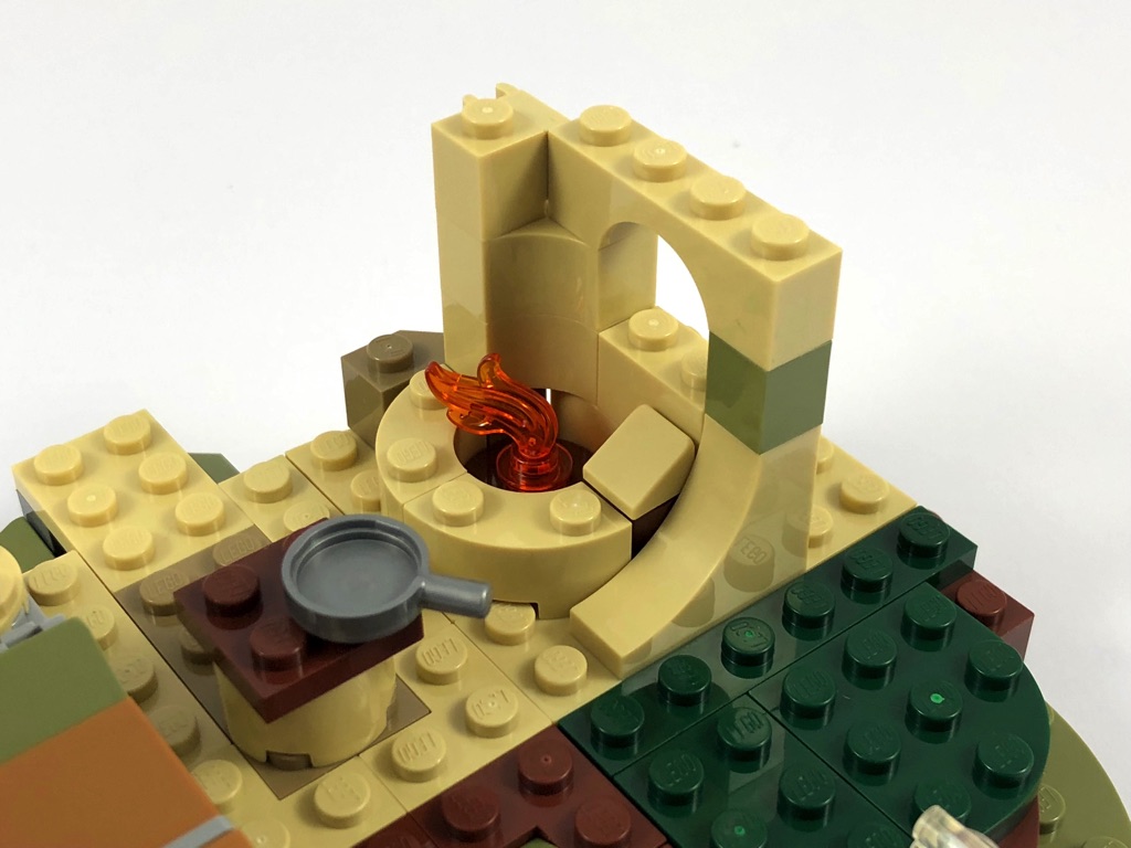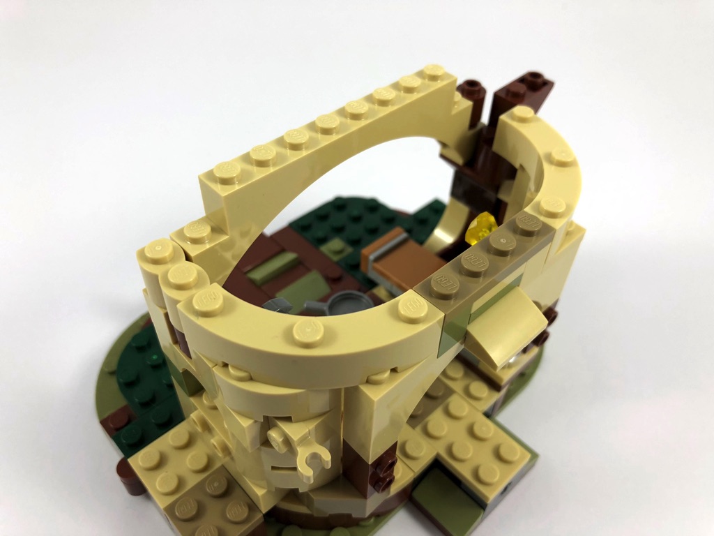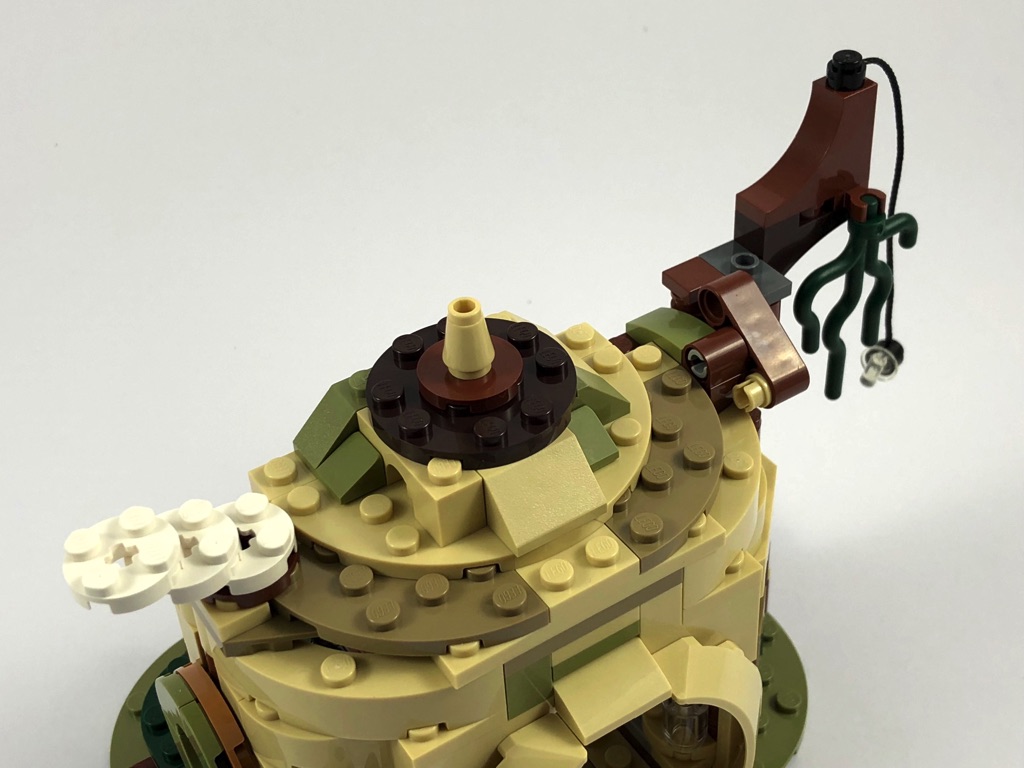 On construit deux grandes arches, qui viendront par la suite soutenir la toiture. On notera un petit détail sympathique : la gemme jaune qui éclaire l’intérieur de la hutte, exactement comme dans le film. Avant de construire le toit, on ajoute une branche avec une liane et une poignée pour y attacher Luke, que l’on peut envoyer voler à l’aide d’une pression sur une pièce Technic. Vient donc le moment de fermer la toiture, et d’ajouter une petite fenêtre pile poil à la bonne hauteur pour que R2-D2 puisse jeter un oeil à l’intérieur.