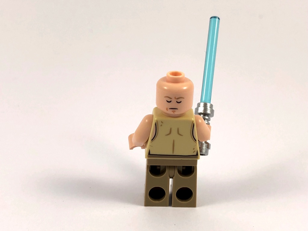 Luke porte un sac à dos (bizarrement réalisé) sur lequel on peut fixer Yoda, pour que Luke le porte comme lors de ses entraînements dans le film. Bon, il faut bien avouer également que, le ratio de taille entre Luke et Yoda étant ce qu’il est pour les minifigs LEGO, le résultat est assez étrange. Enfin, son arme fétiche l’accompagne : un sabre laser en trans light blue.