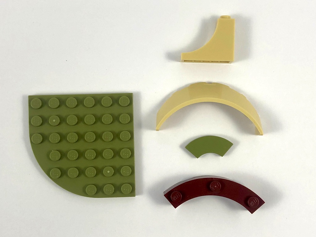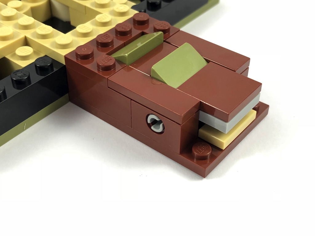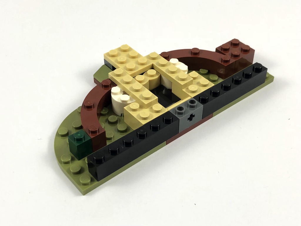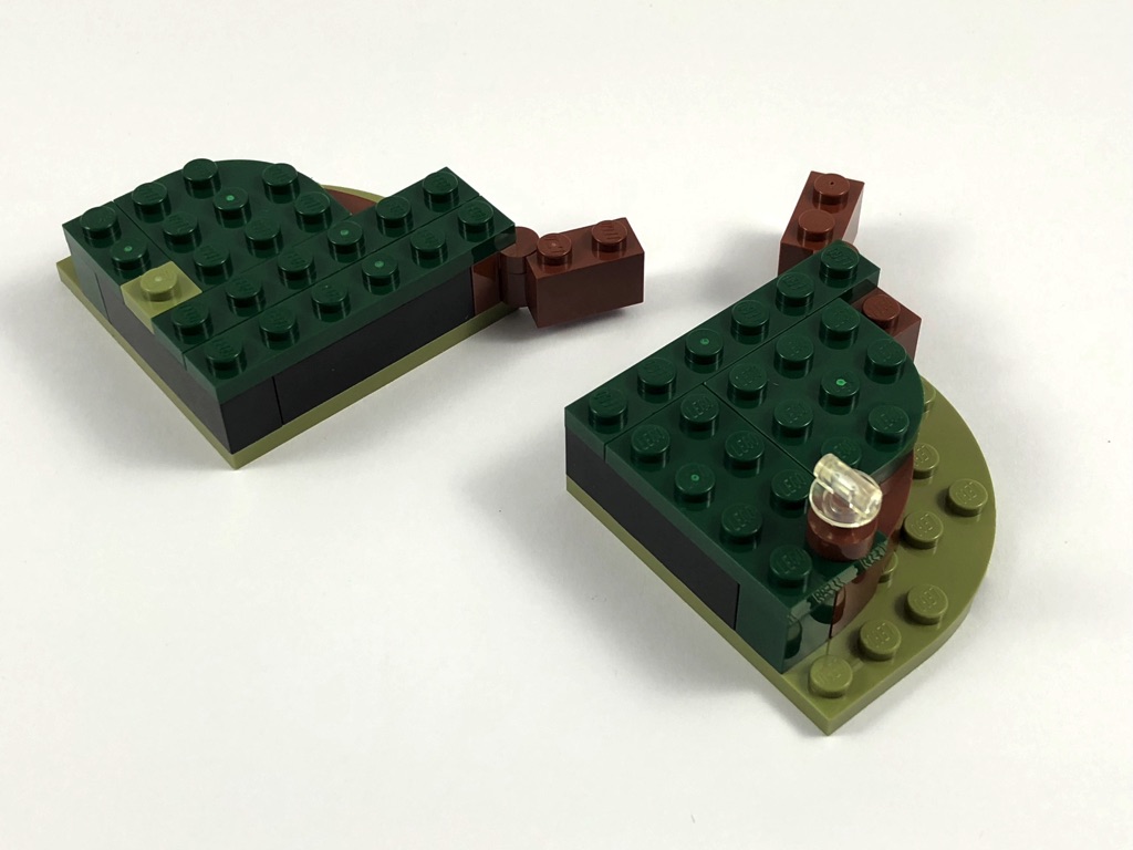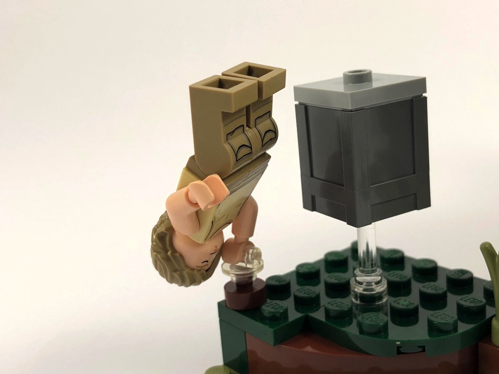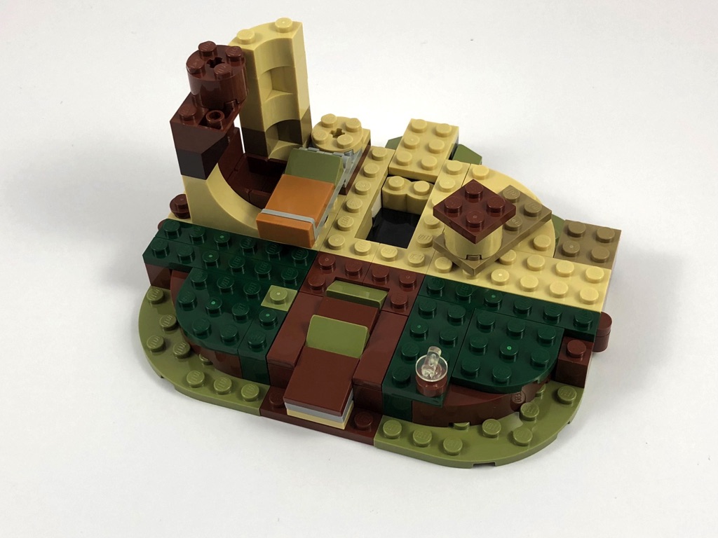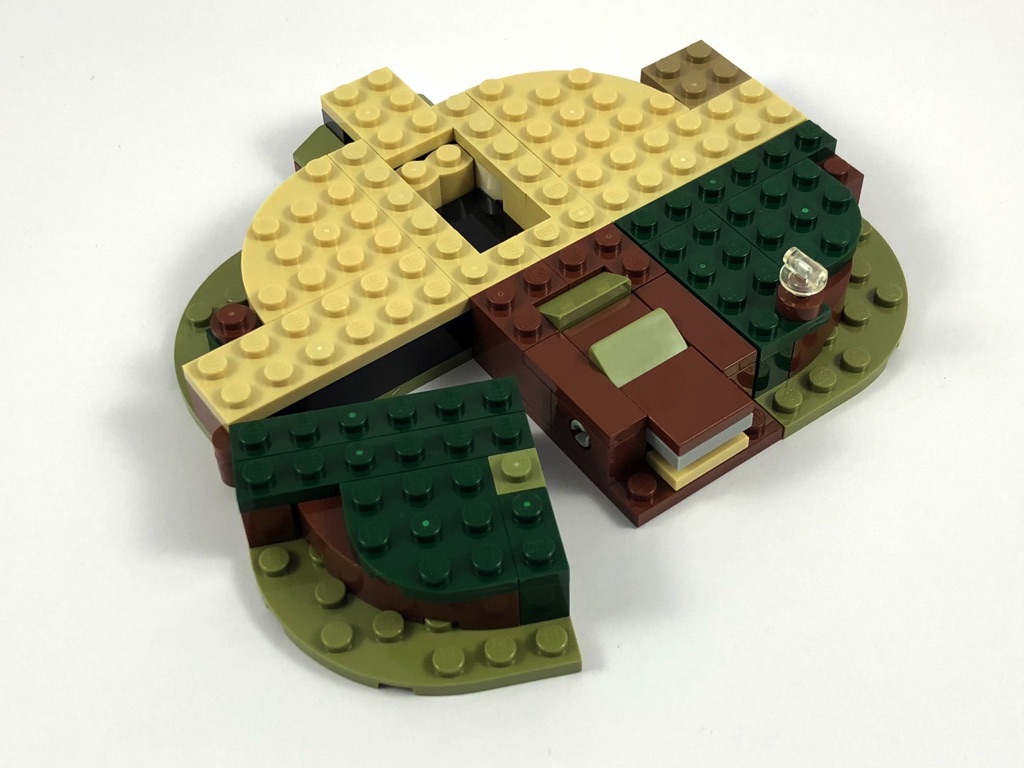 Deux sachets numérotés sont fournis, pour contenir les 229 pièces. Autant dire qu’il ne sera pas nécessaire de faire un tri préalable de celles-ci. On commence par assembler le support qui va recevoir la hutte de Yoda. Il se compose pour l’essentiel d’un mélange d’olive green, de reddish brown et de tan, choix avisé pour représenter le marais dans lequel se trouve cette hutte. On y ajoute le premier élément de jouabilité, une sorte de catapulte permettant d’envoyer valser Luke, articulée sur deux pins Technic.