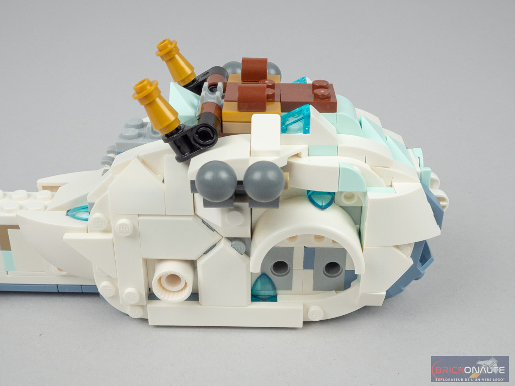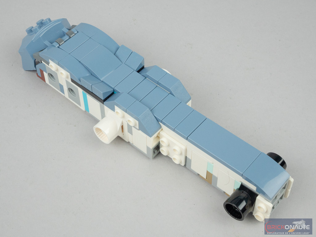 Dans l’étape suivante, on habille les côtés du corps, là encore avec des éléments souvent vus pour reproduire les véhicules. Avec leurs différents formes, ils viennent créer des « écailles » et c’est plutôt réussi. On repasse ensuite sur la partie supérieure du corps sur laquelle on vient fixer de grandes écailles couleur aqua, sur les clips.