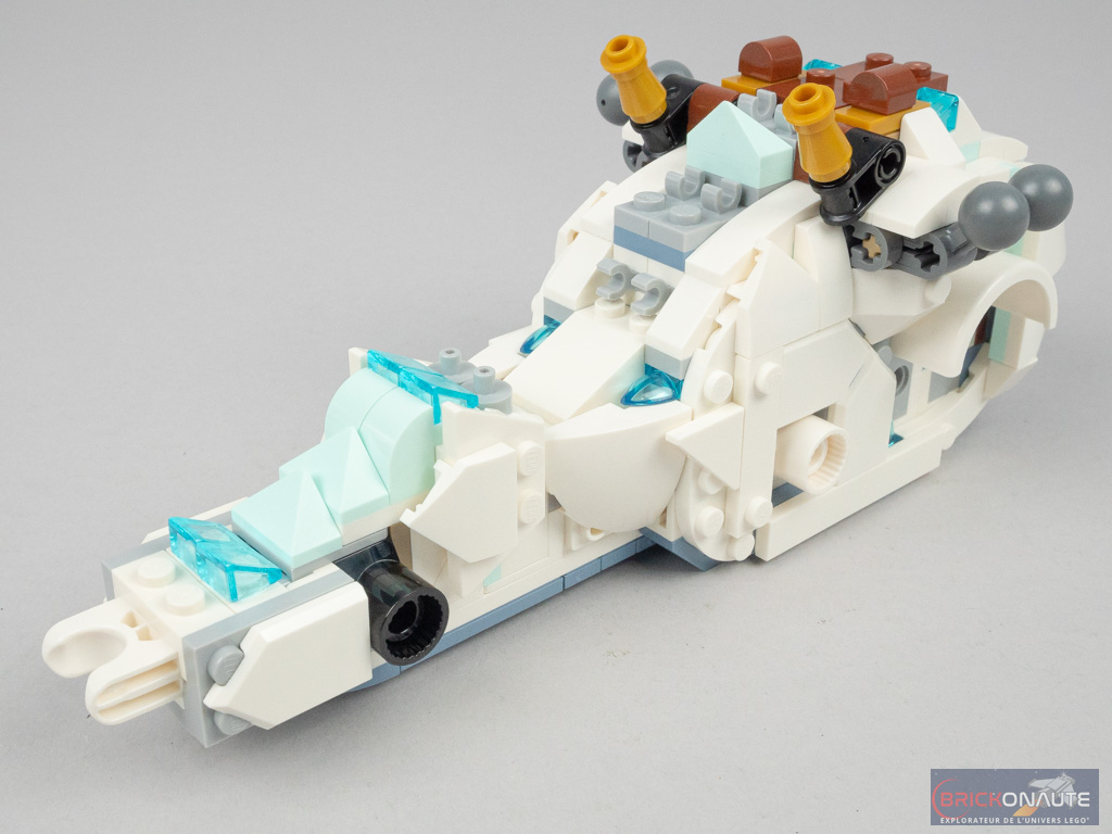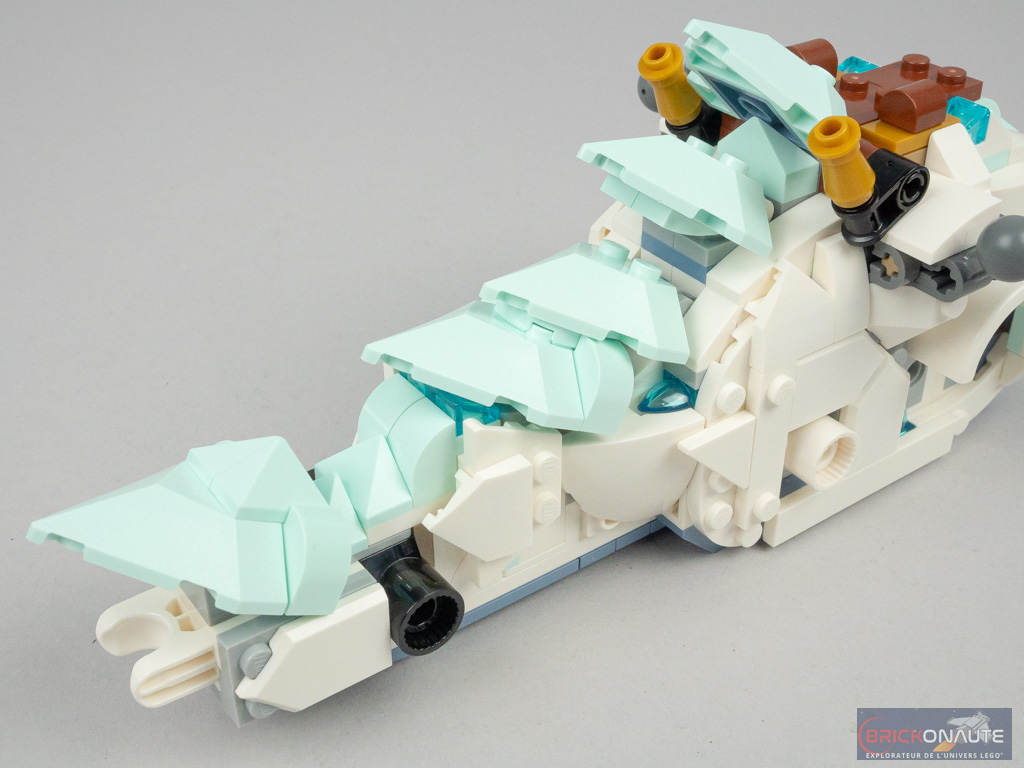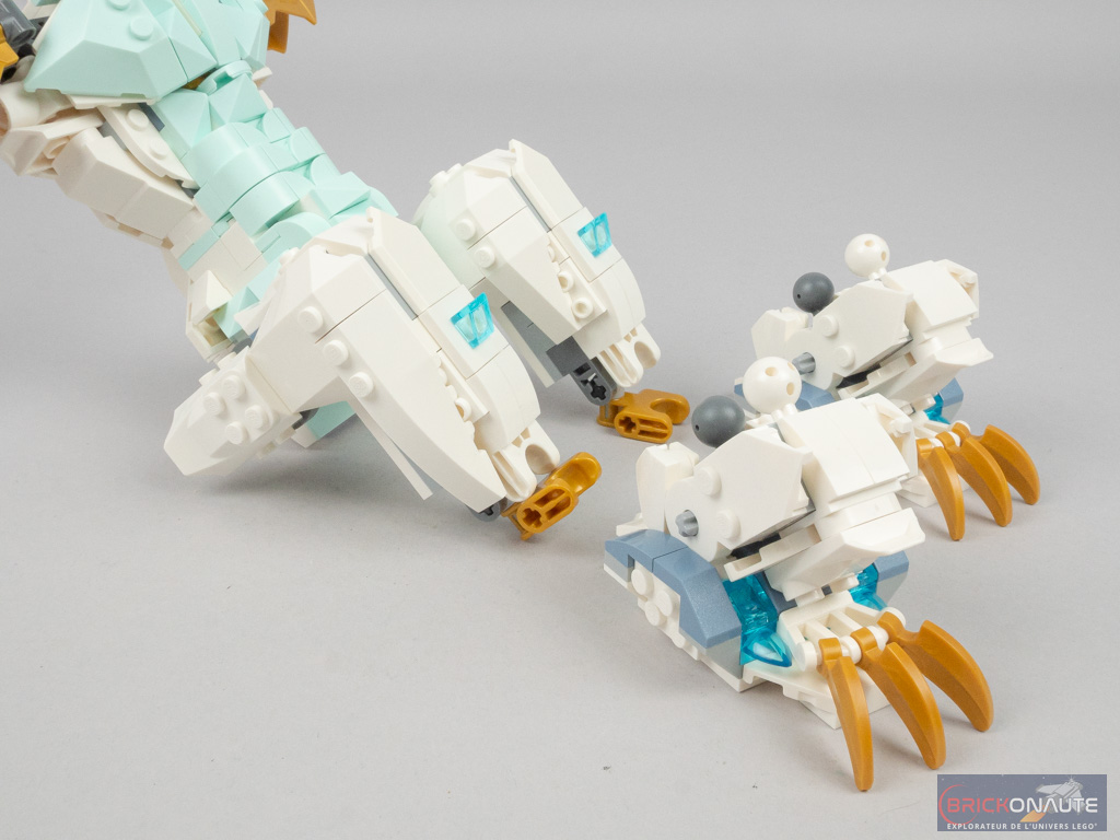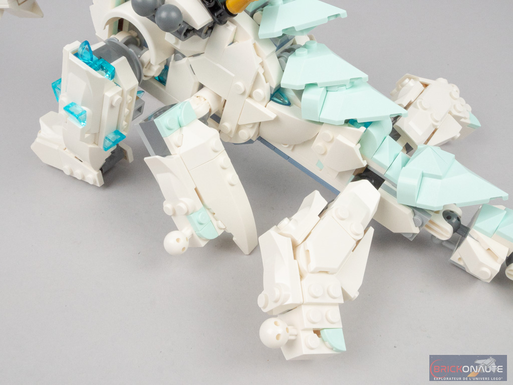 En termes de design, c’est du tout bon pour les deux modèles. À commencer par le modèle principal, le dragon de glace : avec ses 6 pattes, ses grandes ailes, cette très jolie tête tampographiée et ce mélange de couleurs très réussi, LEGO nous propose une créature très originale et bien réalisée.