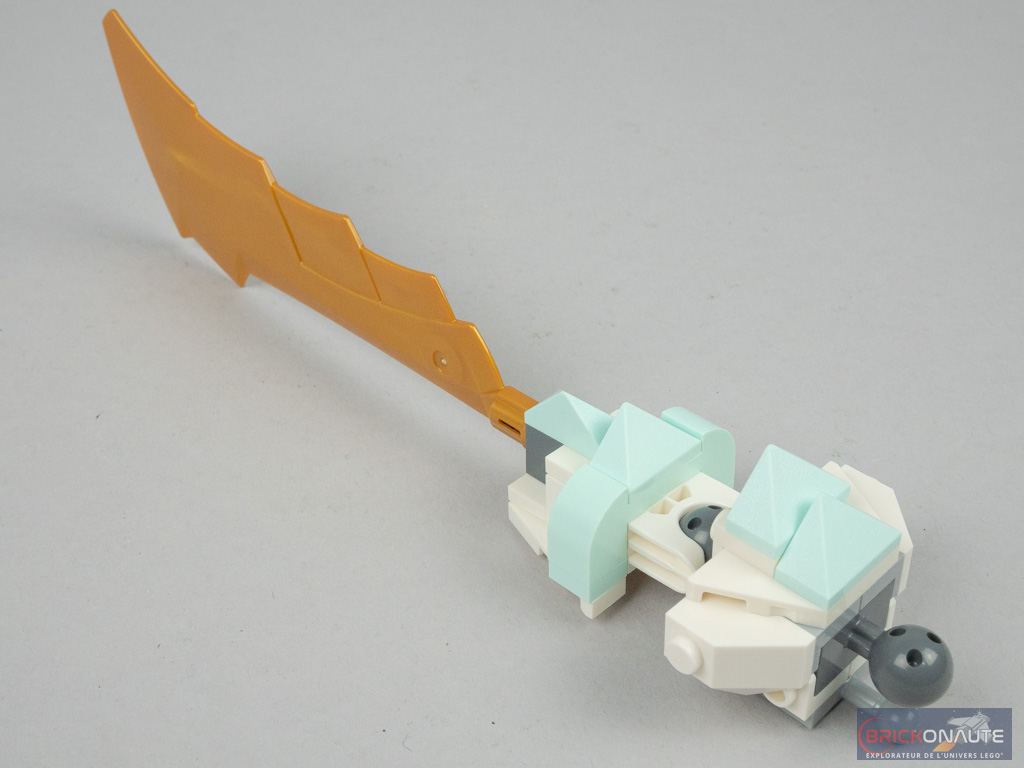 C’est également vrai pour le guerrier dragon, le modèle secondaire. Avec 30cm de haut (au niveau des fanions), il est plutôt imposant et sa musculature est bien rendue par l’utilisation de pièces lisses sur différents niveaux. Les articulations utilisées le rendent stable en position debout, et permettent également de le placer dans de nombreuses postures. Il n’a pas d’articulation au niveau du genou, mais ce n’est pas bien gênant. Seul petit regret à son égard, il ne dispose d’aucun endroit pour y placer Zane qui pourrait alors le diriger.