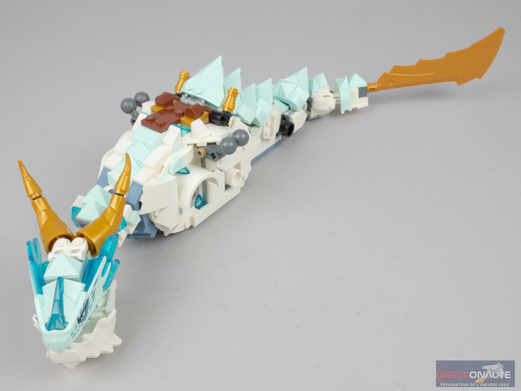 L’inventaire n’est pas spécialement généreux pour un set de la gamme LEGO Ninjago : 973 pièces, pour un prix public de 99,99 €. On appréciera malgré tout quelques très jolis éléments : la tête du dragon, tampographiée, et sa bouche ; les énormes lames bleues translucides ou dorées ; et une belle sélection d’éléments dorés notamment.