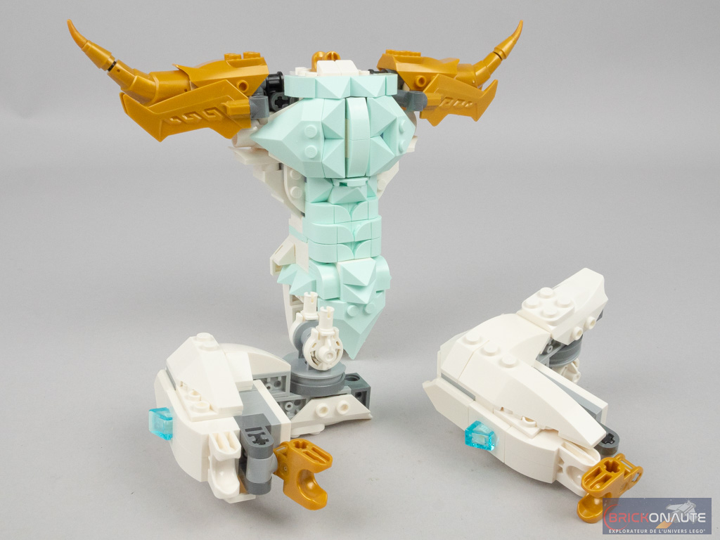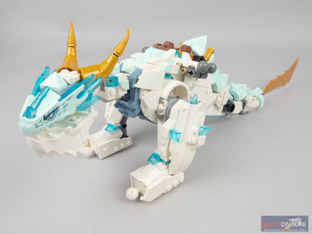 Je le disais un peu plus haut et c’est probablement ce qui m’a le plus déçu : malgré la mention dans le descriptif du produit de la possibilité de construire un dragon de glace […] puis le transformer en guerrier dragon, il ne s’agit pas d’une simple transformation – il faudra bien tout démonter pour recommencer avec le second modèle. C’est un modèle 2 en 1, comme on peut trouver des modèles alternatifs dans la gamme Creator par exemple. Cette petite « surprise » mise à part, il s’agit malgré tout d’une seconde construction de qualité, et réutilisant une grande partie de l’inventaire (125 pièces inutilisées, sur un total de 973).