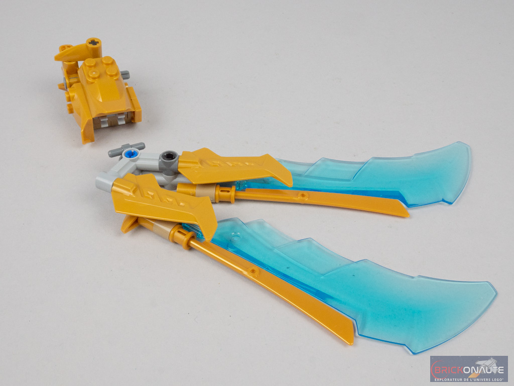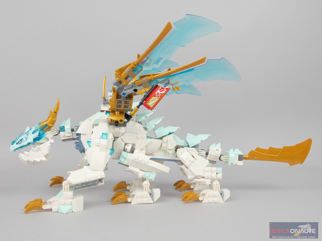 Les ailes sont assemblées en deux parties. La première, dorée, vient se fixer directement sur les rotules présentes en haut du corps. La deuxième partie est plus complexe et fait appel à des éléments Technic pour obtenir les angles désirés. Les grandes lames bleues translucides viennent alors parfaitement s’ajuster avec les petites lames dorées, l’effet obtenu est vraiment réussi. Il ne reste qu’à fixer deux fanions rouges, et notre dragon de glace est terminé !