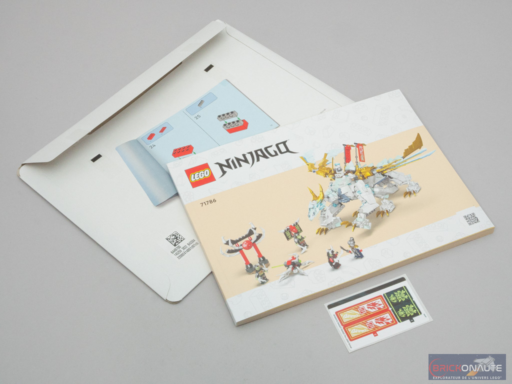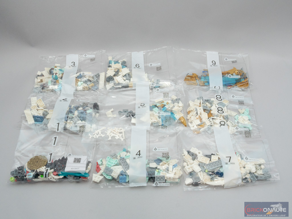 À l’intérieur de la boîte, on trouve 9 sachets de pièces numérotés et une pochette cartonnée contenant la notice d’instructions de 256 pages et une petite planche de 4 autocollants, rien de bien méchant.