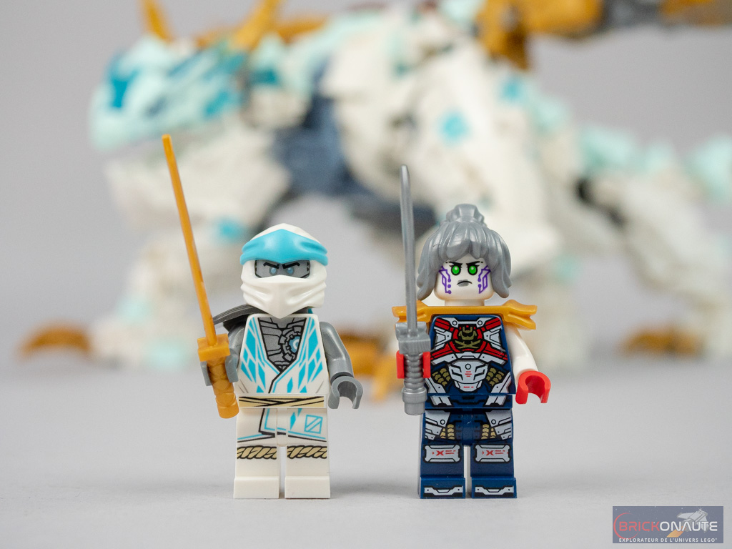 Du côté des gentils, on retrouve le héros de ce set, Zane, et l’androïde Pixal (qui a aidé Zane à revenir lorsque ce dernier a disparu pour vaincre l’Overlord – si j’en crois le Wiki LEGO 😉). Cette dernière est identique à la version vue dans le set 71767 Ninja Dojo Temple, avec une très belle armure dark blue, des épaulettes dorées, un double visage et une chevelure argentée. Zane est pour sa part identique à la minifig du set 71765 Ninja Ultra Combo Mech, avec une très jolie tenue blanche et bleue et un corps argenté. Malgré le fait que son visage soit masqué, il est bel et bien tampographié des deux côtés – l’arrière n’étant toutefois pas un visage secondaire.