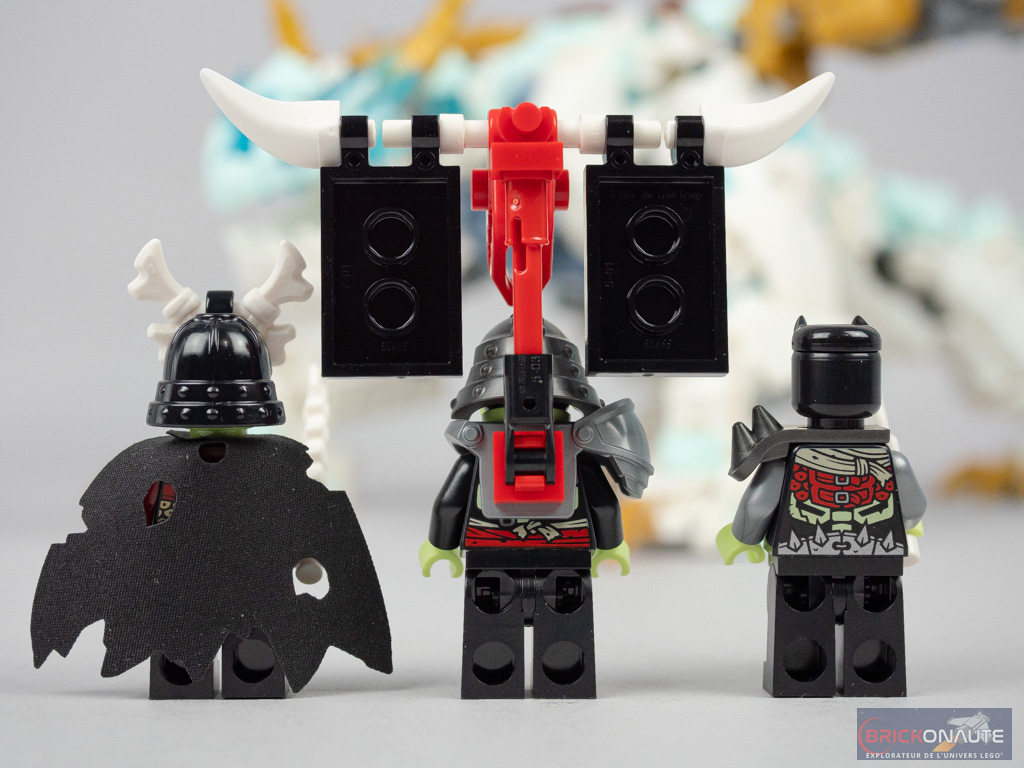 Avec cette nouvelle série de produits, les ninjas seront aux prises avec une armée squelette dont on retrouve ici 3 membres – on les retrouve également dans d’autres boîtes de cette même série mais dispersés dans plusieurs références. Les héros sont ici représentés par Zane et Pixal. Comme d’habitude dans cette gamme, les tampographies sont soignées et réussies, un bon point de ce côté là. Mais seulement 5 minifigs dans une boîte vendue une centaine d’euros, c’est un peu juste comparativement à ce qui se fait habituellement chez les Ninjago.
