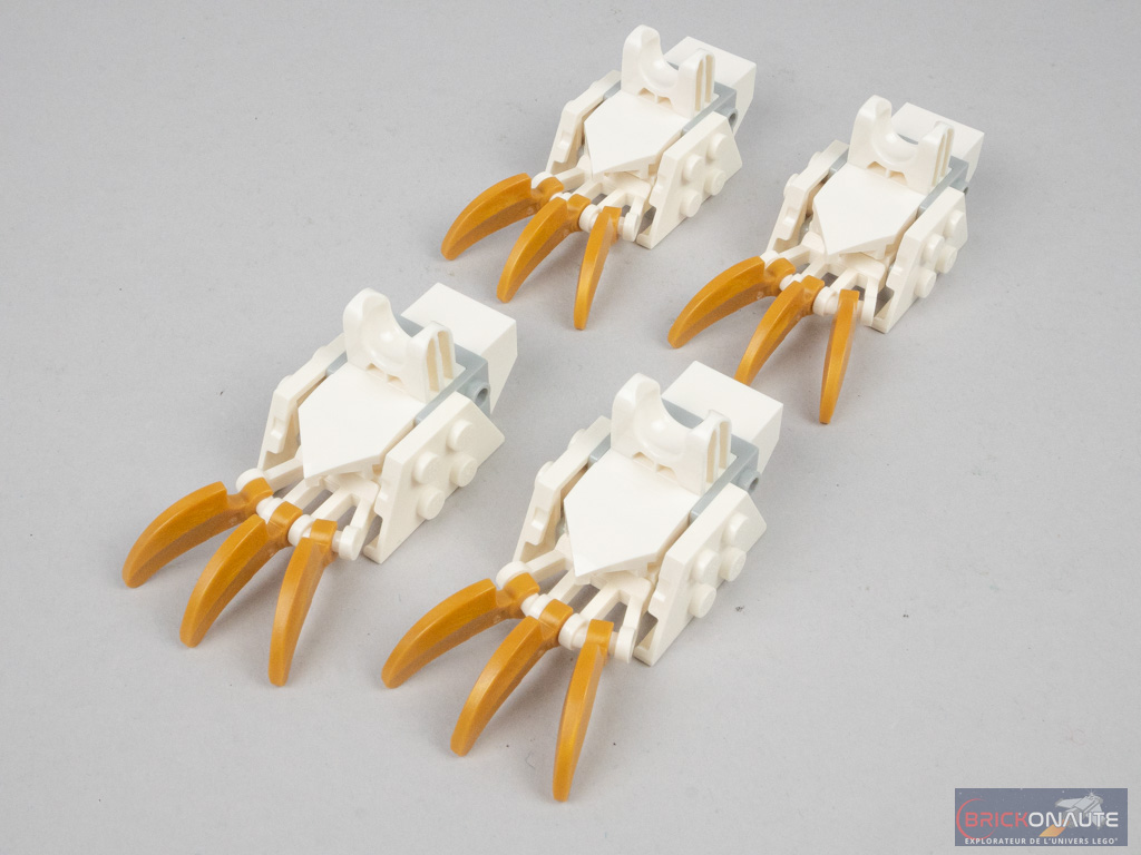 On assemble ensuite la queue, constituée de simplement deux éléments articulés entre eux par des rotules. Une grande lame dorée est fixée à l’extrémité. On passe alors à la tête avec ces jolies pièces spécifiques. La mâchoire est simplement tenue par des petits robotic arms – l’assemblage est un peu fragile. La tête est fixée sur une rotule au corps. Remarquez ici les jolies cornes dorées, un nouvel élément introduit avec ce set.