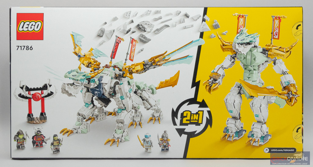J’aime beaucoup le design des boîtes LEGO Ninjago, et cette nouvelle série de sets ne fait pas exception. Sur la face avant de la boîte, au format allongé, on retrouve Zane assis sur le dos de son dragon et Pixal à ses pieds, qui s’apprêtent à livrer bataille aux chevaliers squelettes en train de traverser un pont. Au dos, LEGO nous précise que deux constructions sont possibles avec l’inventaire fourni – le dragon à 6 pattes et un « guerrier dragon » humanoïde.
