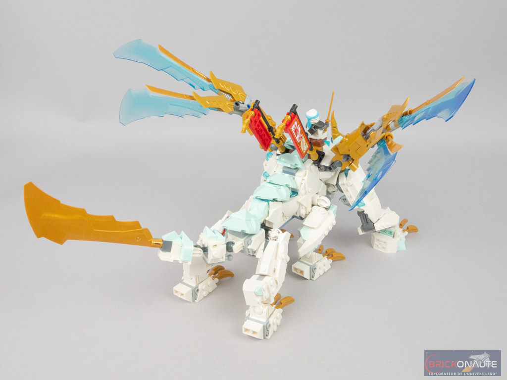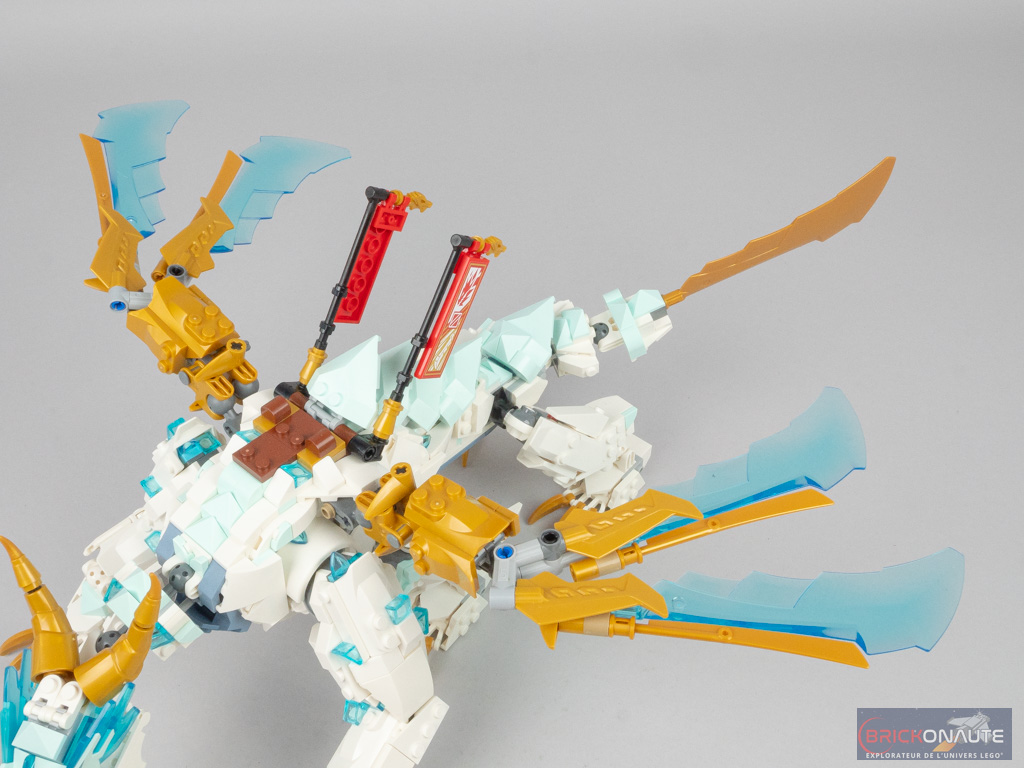 Les ailes sont assemblées en deux parties. La première, dorée, vient se fixer directement sur les rotules présentes en haut du corps. La deuxième partie est plus complexe et fait appel à des éléments Technic pour obtenir les angles désirés. Les grandes lames bleues translucides viennent alors parfaitement s’ajuster avec les petites lames dorées, l’effet obtenu est vraiment réussi. Il ne reste qu’à fixer deux fanions rouges, et notre dragon de glace est terminé !