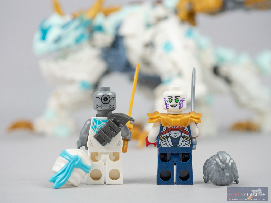 Du côté des gentils, on retrouve le héros de ce set, Zane, et l’androïde Pixal (qui a aidé Zane à revenir lorsque ce dernier a disparu pour vaincre l’Overlord – si j’en crois le Wiki LEGO 😉). Cette dernière est identique à la version vue dans le set 71767 Ninja Dojo Temple, avec une très belle armure dark blue, des épaulettes dorées, un double visage et une chevelure argentée. Zane est pour sa part identique à la minifig du set 71765 Ninja Ultra Combo Mech, avec une très jolie tenue blanche et bleue et un corps argenté. Malgré le fait que son visage soit masqué, il est bel et bien tampographié des deux côtés – l’arrière n’étant toutefois pas un visage secondaire.