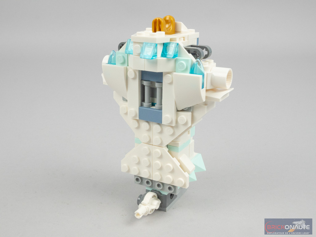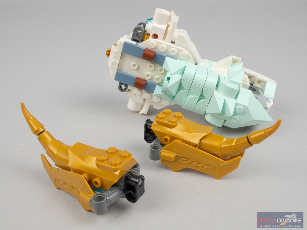 Dans l’étape suivante, on habille les côtés du corps, là encore avec des éléments souvent vus pour reproduire les véhicules. Avec leurs différents formes, ils viennent créer des « écailles » et c’est plutôt réussi. On repasse ensuite sur la partie supérieure du corps sur laquelle on vient fixer de grandes écailles couleur aqua, sur les clips.